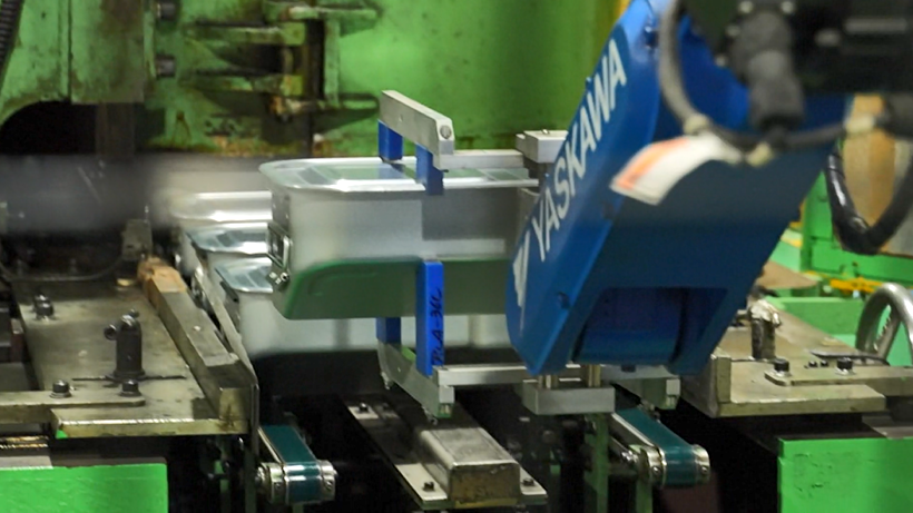 使うのはアルミ板で、ロボットアームがプレス機の中へパネルを入れると、ぽっかりと穴が空いた。これは、点火する時に回すダイヤルを取り付けるための穴。ここから4回のプレスをへて、本体にフィットする取り付けやすい形になる。