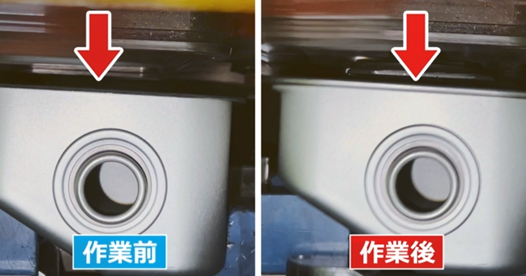 油タンクの上の部分に注目すると、フチを重ねて外側に巻くことで、2つのパーツを完全に接着していた。作業前と後を比べると、しっかり接着しているのが分かる。