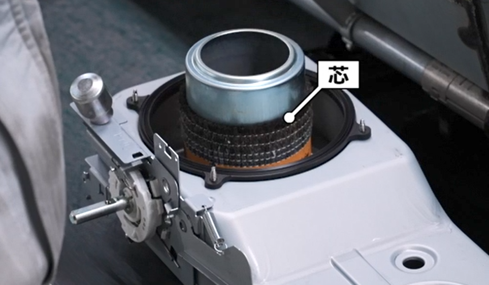内側のパーツは人の手で組み立てる。点火の要となる場所に取り付けたのは、「芯」。火を灯す大切な部品だ。しっかりと固定して、少しだけ灯油を注入する。