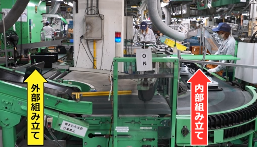 油受け皿と合体した「置台」と「ボディ」は長いベルトコンベヤーに乗り、組立ブロックへ。
