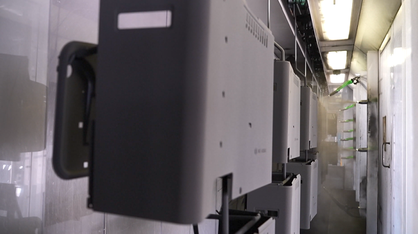塗装作業はすべてロボットが担当。ストーブの一番下に置く「置台」も、一緒に黒く塗り上げる。