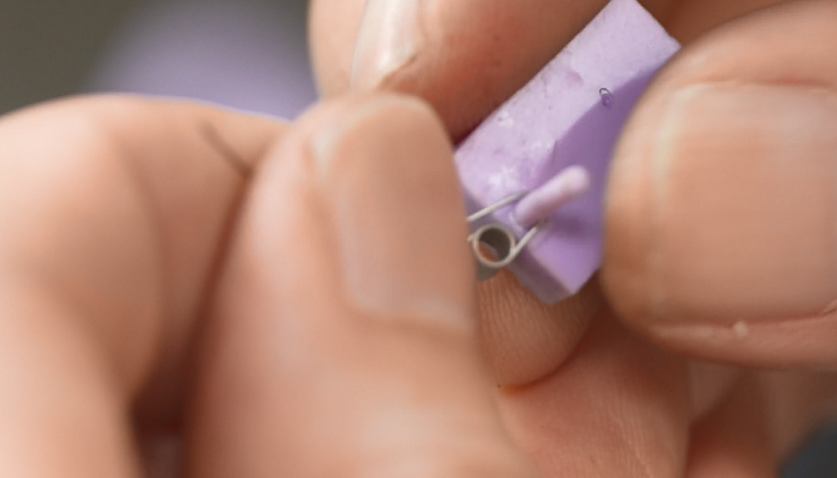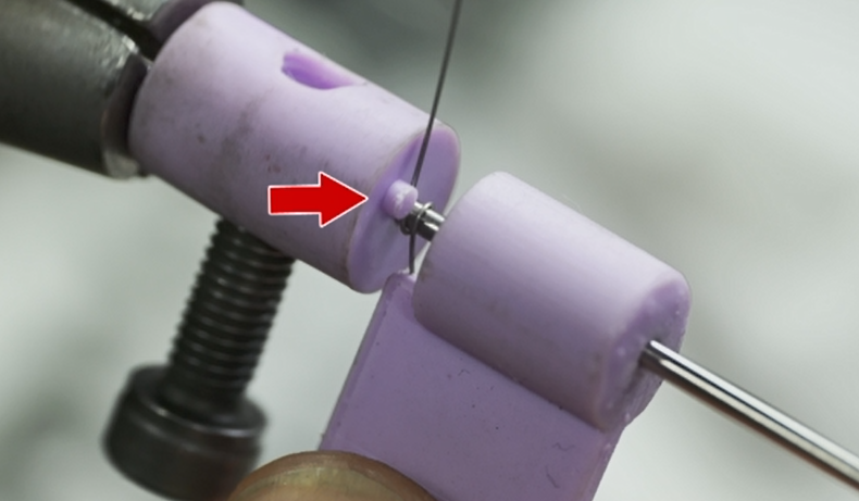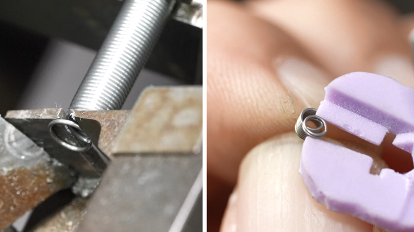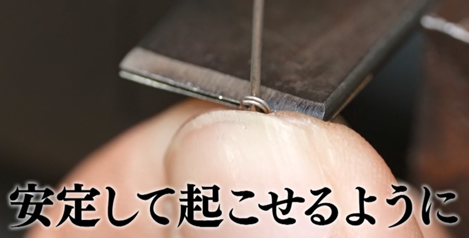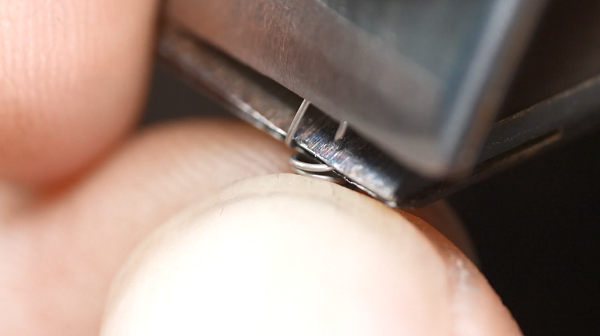 続いては、右側のフック作り。通常の引きばねはフックの部分が一周しているのに対して、このばねは少し隙間が空いている特殊な形状。しかも、直径1.8ミリというサイズだ。