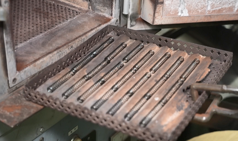 出来上がった押しばねは、15分間、約300℃の熱を加えた後に冷やすことで強度が数倍に跳ね上がる。