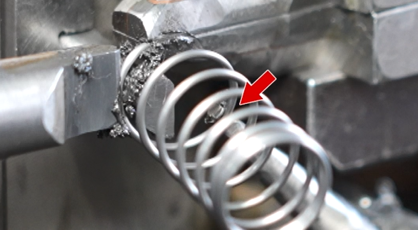 押しばねと同じ工程で作られたばねが所定の位置に運ばれると、アームが先端部分を押し出し、押し出した部分を起こすことで、輪っかが作られる。実に器用なマシンだ。