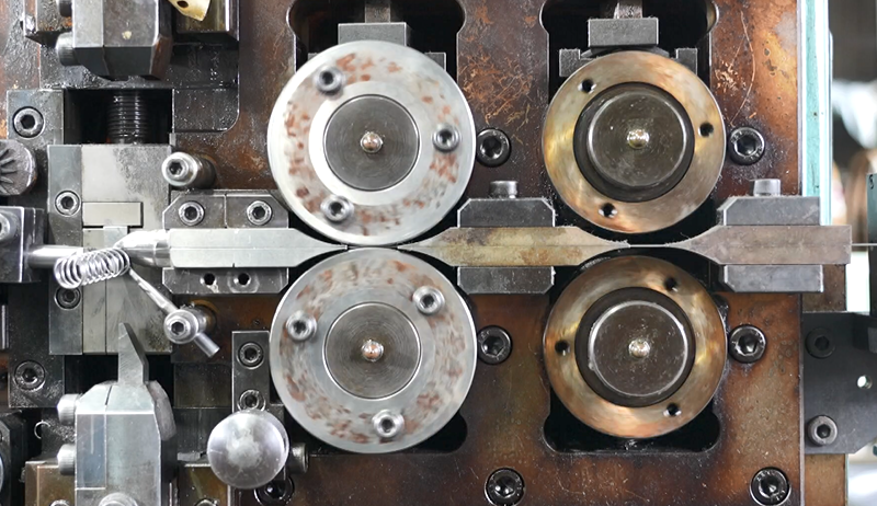 まずは「押しばね」の製作工程を見ていこう。ばねの材料となるのはステンレス製の針金。これを、4カ所の輪っかに通して送り出すことで巻きぐせを直し、真っすぐにする。