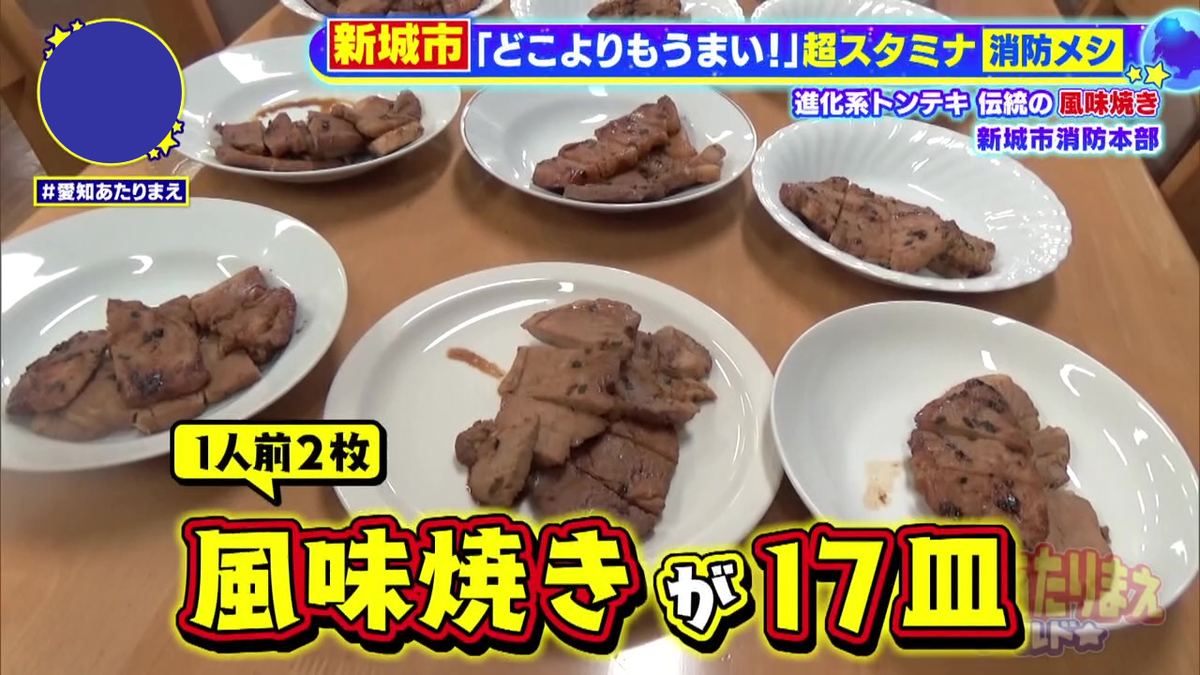 新城市消防本部の伝統となっている“消防メシ”が「風味焼き」。縮みを防ぐために切り込みを入れた豚肉を、醤油、みりん、たっぷりのネギ、そして消防メシの主役ともいえるニンニクとショウガを合わせて3時間漬け込んでから焼き上げる、パワフルさ満点の新城消防本部ならではのとんてきです。