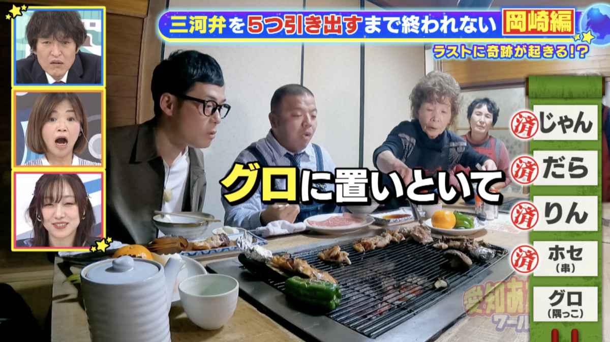 しかしお店の方から返ってきた言葉は、まさかの「串」。一瞬、失敗かと思われましたが、会話を続けるうちに、ついに「ホセ」が登場。これで難関「ホセ」を突破し、残す三河弁は「じゃん」「だら」「グロ」の3つとなりました。