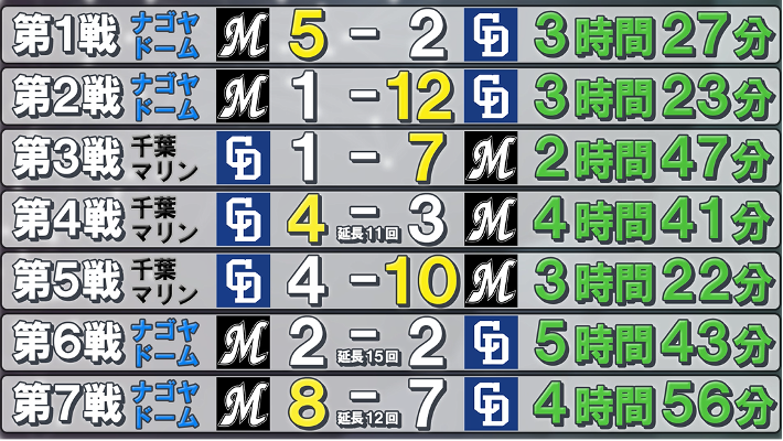 千葉ロッテと対戦し、3試合が延長戦となり1試合は引き分けで第7戦までもつれ込んだ2010年の日本シリーズ。試合時間も長く、引き分けに終わった第6戦は5時間半を超えた。